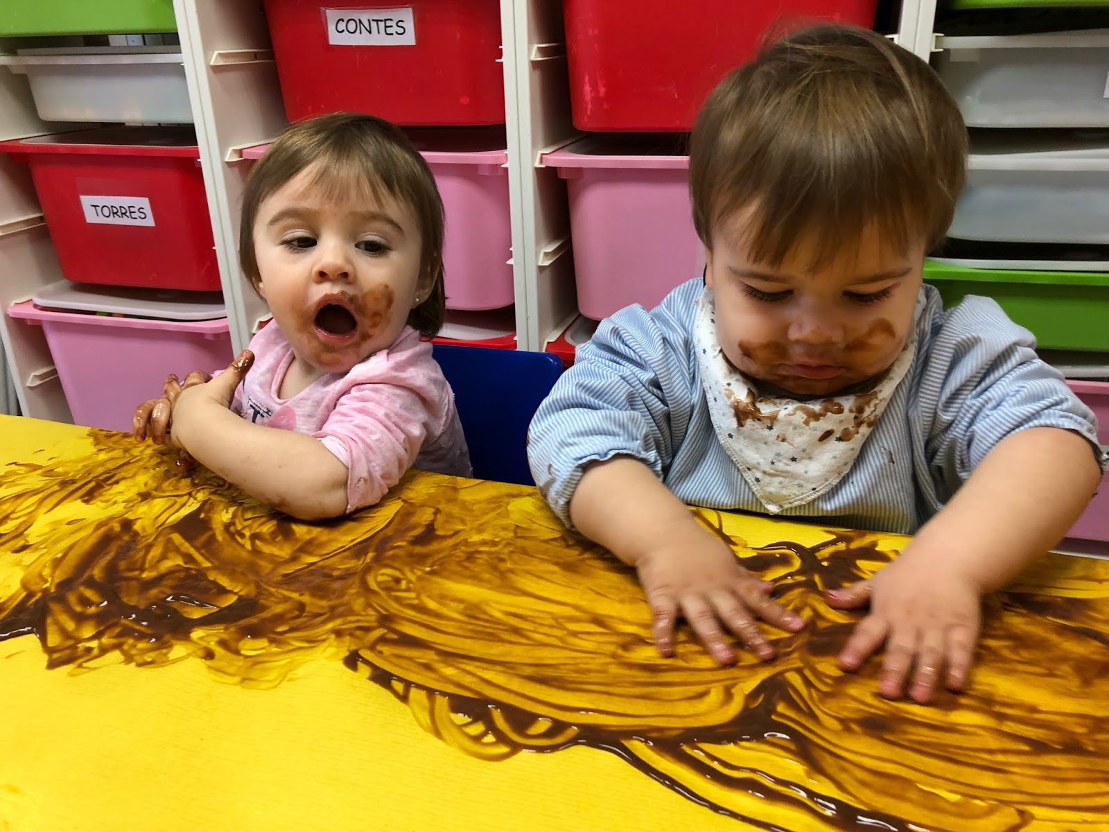Una de les activitats que més ens agrada. Quan vam començar a experimentar amb xocolata ens vam mostrar una mica tímids ficant només un dit, però a poc a poc tots vam acabar amb les mans dins de la xocolata i llepant-nos els dits... mm que bona!