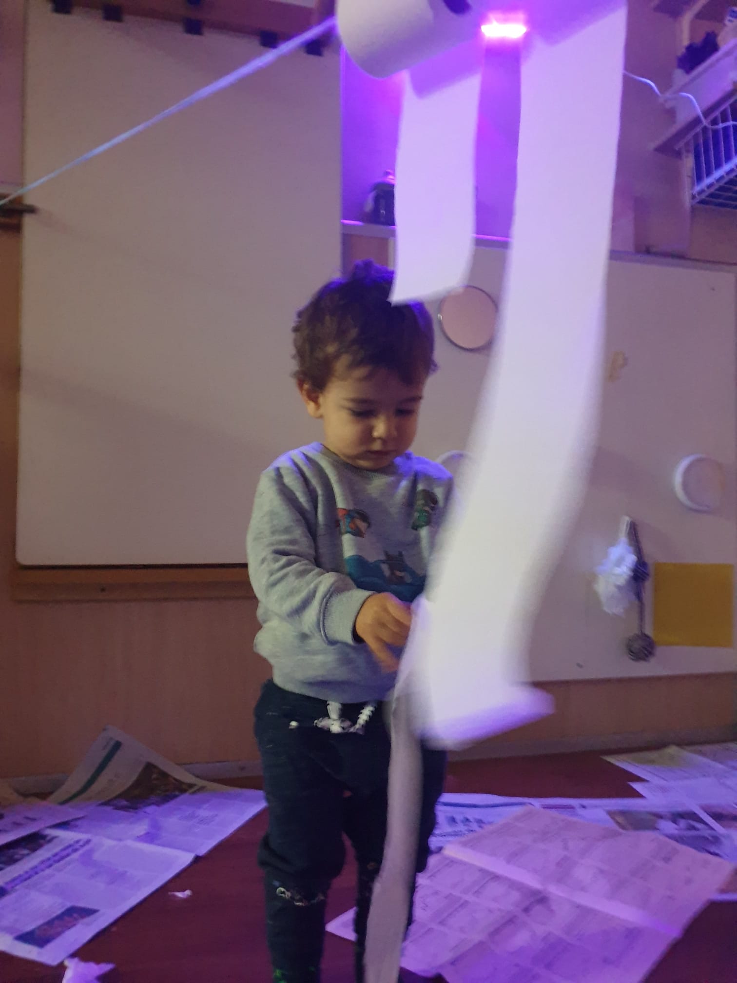 El motiu de fer el bon dia a una altra aula és per la sorpresa que els tenia preparada, cobrir tooooot el terra de l'aula amb paper de diari i diversos rotllos de paper penjant d'un fil. 😙